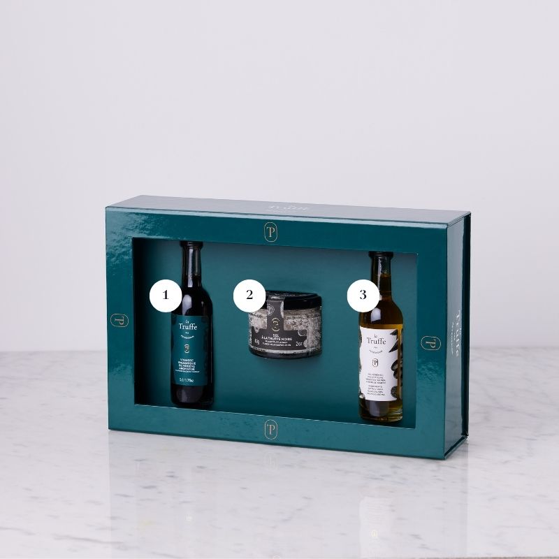 Le coffret initiation truffe est idéal pour réaliser de savoureux assaisonnements parfumés à la truffe. Il est composé d'une huile d'olive à la truffe blanche de 5 cl, d'un vinaigre de Modène aromatisé à la truffe de 5 cl et d'une fleur de sel à la truffe noire.