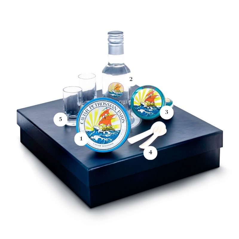 La scatola Caviar de l'Amour™ è un dono da offrire per condividere emozioni intense di coppia degustando il caviale. Questa scatola contiene tutto il necessario per perfezionare questo momento. Si compone di una scatola di caviale da 125g della selezione a scelta, una classica vodka Petrossian, due bicchierini, due scatole di perle di vodka e due cucchiaini di madreperla. La scelta può avvenire tra il nostro Daurenki® Royal, Oscietra Royal, Baïka® Tsar Impérial™ o il caviale Beluga Tsar Impérial, in scatola da 125 g.<br><br><i>Per acquistare alcolici è necessario avere almeno 18 anni. Ci riserviamo il diritto di chiedervi di giustificarlo e di annullare il vostro ordine se abbiamo motivo di credere che siate minorenni.