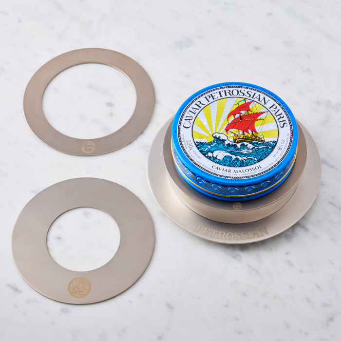 Maak uw service compleet met de ringen voor de Petrossian kaviaarstandaard, ontworpen om blikjes van 50 g tot 250 g perfect te plaatsen. Gemaakt van staal en gegraveerd met het Petrossian-logo, maken deze ringen het eenvoudig om de maat van het blik aan te passen en tegelijkertijd een elegante presentatie te bieden.