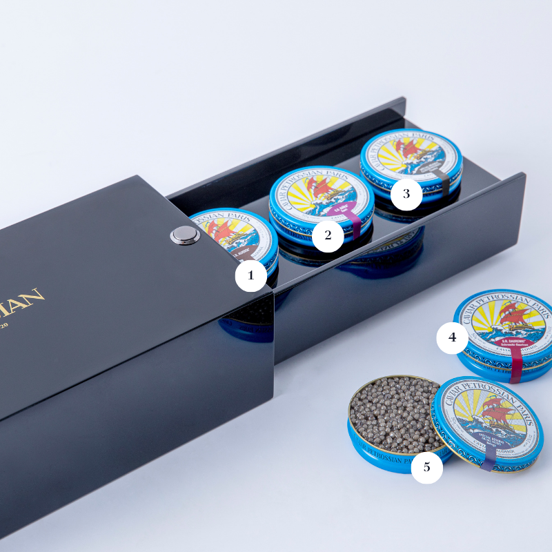 Le coffret Caviar Spécial Réserve® regroupe tous les caviars en sélection Spécial Réserve®. Offrez ce cadeau d'exception pour déguster nos plus beaux caviars disposés dans leur étui en bois laqué bleu sur-mesure. Proposé en édition limitée sur le e-shop, ce coffret cadeau caviar comprend 6 caviars Spécial Réserve® en boîtes de 50 g : deux boîtes de caviar Ossetra Spécial Réserve®, une de caviar Beluga Spécial Réserve®, une de caviar Acipentris® Spécial Réserve®, une de caviar Daurenki® Spécial Réserve® et une de caviar Sevruga Steluga® Spécial Réserve®.