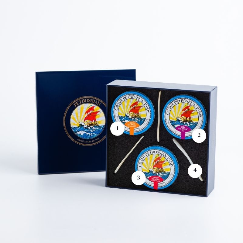 Ce coffret La Trilogie des Caviars est l'occasion d'offrir une dégustation de nos emblématiques caviars de la Maison. Les trois caviars Ossetra, Baïka® et Daurenki® sont présentés avec leurs trois palettes en nacre dans une élégante boîte métallique lithographiée Petrossian. En somme le cadeau idéal pour une initiation à l'univers du caviar approfondie. Ce coffret se décline avec des boîtes de caviar de 30 g ou 50 g et en sélection Royal ou Tsar Impérial®.